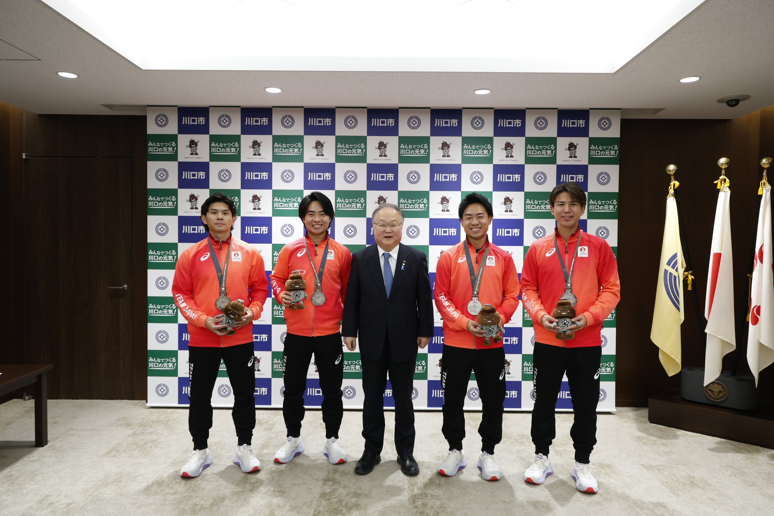 これに対し、奥ノ木市長からは「4人は川口の宝であり、誇り。夢や希望を与えてくれた。」と、温かい激励の言葉が贈られました。その後、選手と市長が和やかに歓談し、市長より記念品が贈呈されました。最後に原口選手・岡田選手らと市長が揃って記念撮影を行い、表敬訪問は終了しました。