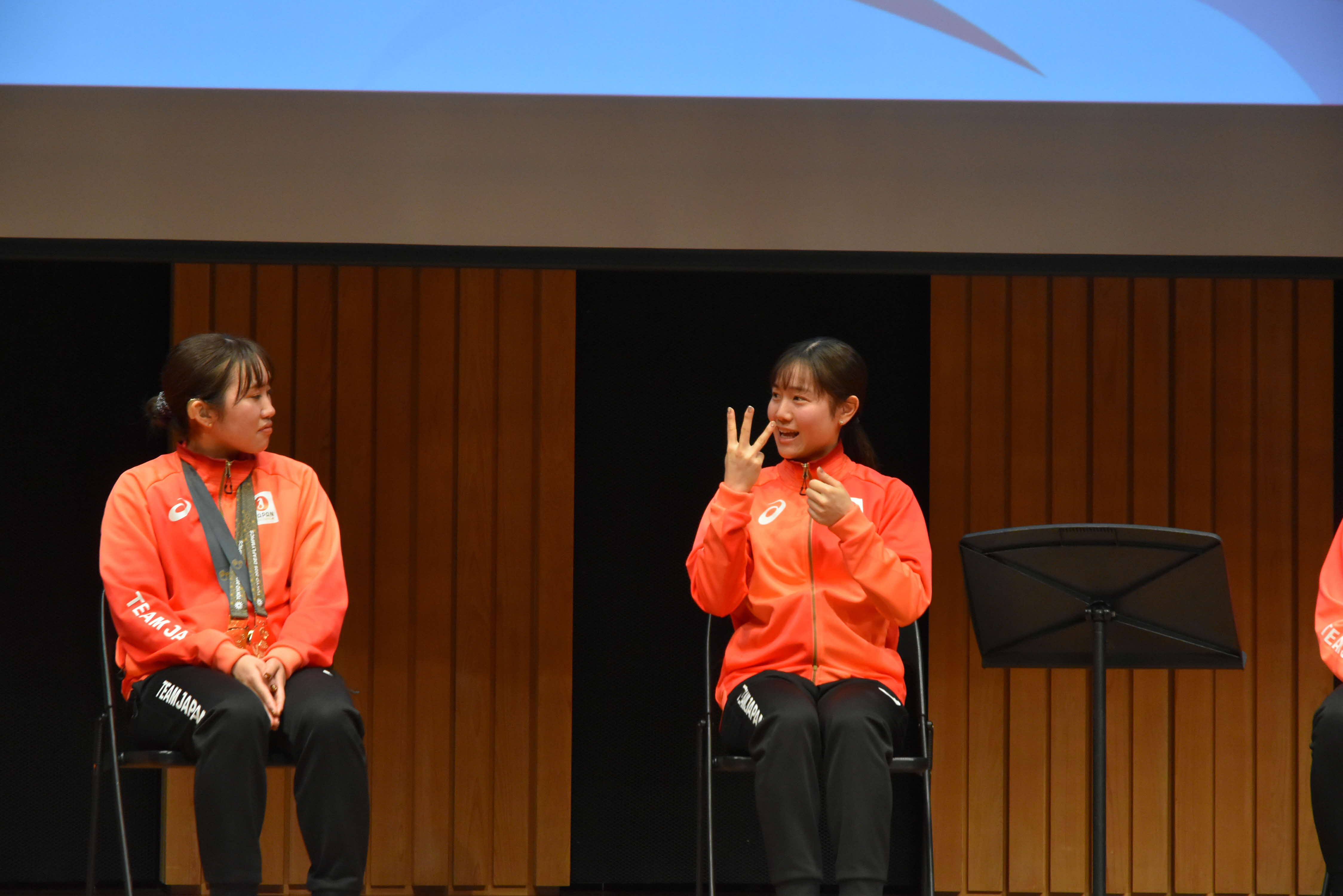 一方、矢ケ部選手には、日本代表チーム内でのコミュニケーション方法について質問がありました。「代表内では、みんな手話ができるので手話と音声の両方を使っています」と、チームの雰囲気を紹介しました。