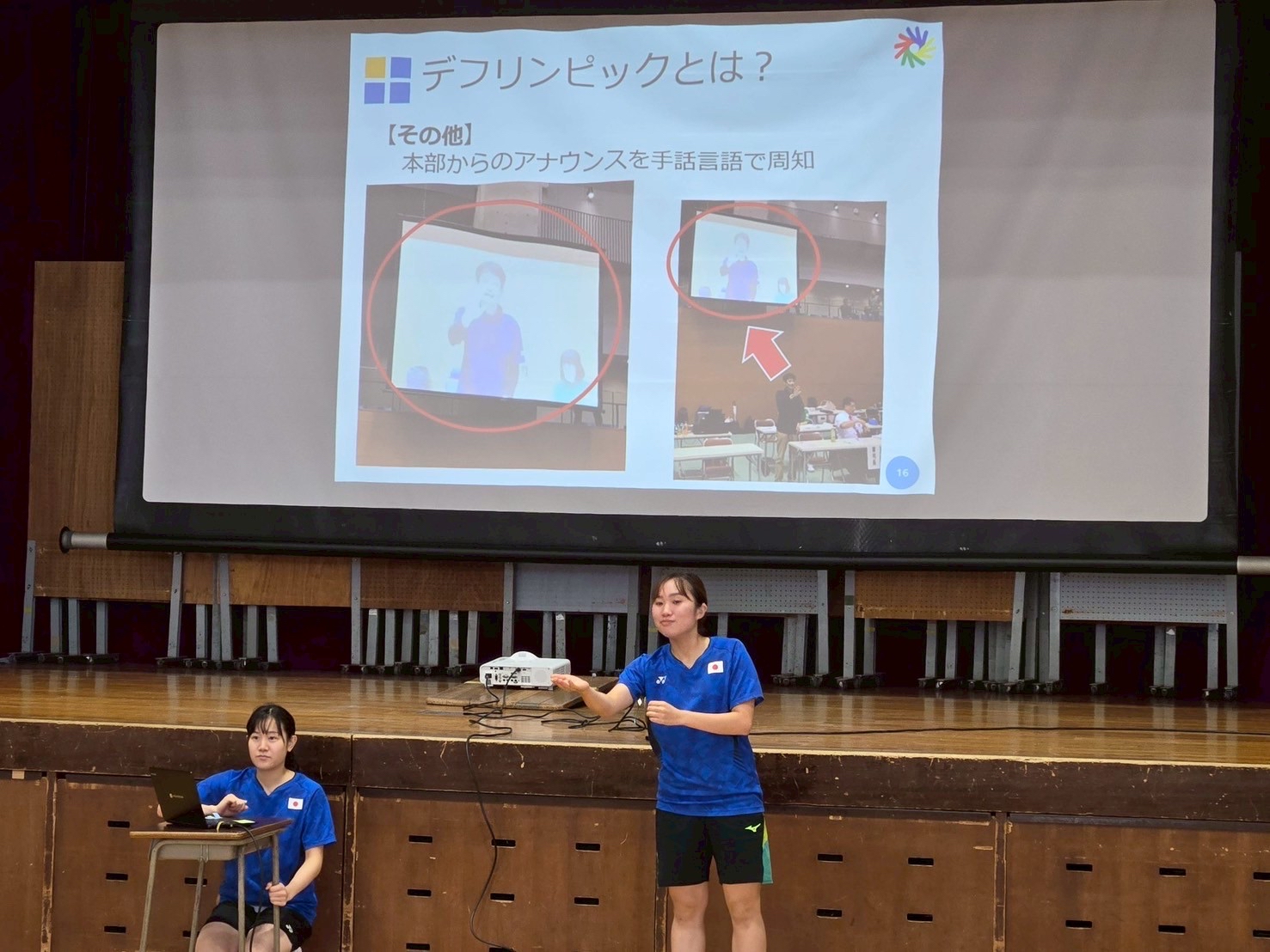 講演後、選手によるデモンストレーションが行われ、デフバドミントン体験が実施されました。