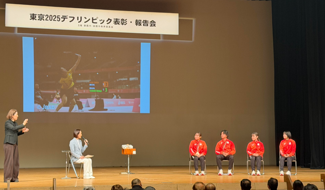 2026年1月13日(火)18:30~19:30、ゆめぱれす(朝霞市民会館)ホールで開催された「東京2025デフリンピック表彰・報告会」に、デフバドミントンの長原選手、矢ケ部選手、鎌田選手が参加しました。