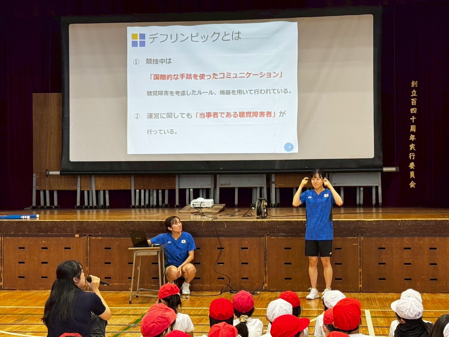 矢ケ部選手・鎌田選手含めたデフバドミントン日本代表選手3名は、小学校4年生4クラスと特別支援学級の児童138名を対象に自己紹介後、デフスポーツやデフリンピックについての講演を行いました。